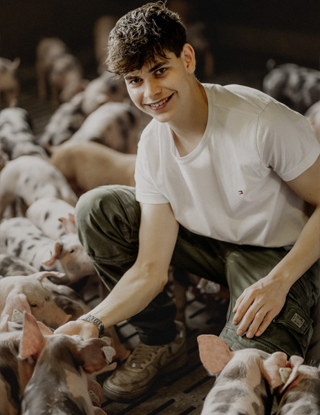 Alle auf dem Betrieb geborenen Ferkel werden gefüttert, aufgezogen und bis zur Schlachtreife gemästet. Damit es den Schweinen so gut geht, werden sie tierschutzgerecht und nach QS-Kriterien aufgezogen. Hochwertige Futtermittel, moderne und klimatisierte Ställe sind selbstverständlich.